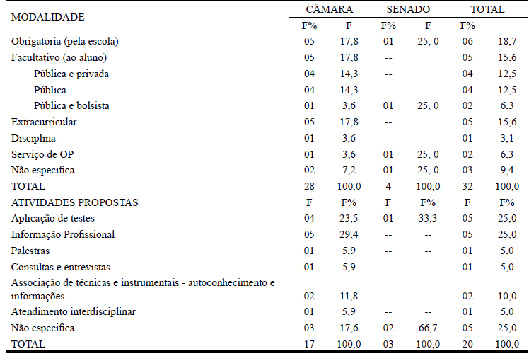 Desta forma, o PLS 426/2015 inova ao estender o escopo da Orientação Profissional para o ensino fundamental e permitir que se amplie também os objetivos para além da escolha de um curso superior ou profissionalizante. Considera-se esse avanço importante na medida em que garantir que as atividades de orientação se estendam ao ensino fundamental, abriria espaço para que atividades de Educação para a Carreira contribuíssem para que o aluno possa valorizar os diversos saberes e vivências culturais e se aproprie de conhecimentos e experiências que lhe “possibilitem entender as relações próprias do mundo do trabalho e fazer escolhas alinhadas ao exercício da cidadania e ao seu projeto de vida, liberdade, autonomia, consciência crítica e responsabilidade” (Brasil, 2018, p. 9). Quanto às modalidades de inserção e aos tipos de atividades da Orientação Profissional no contexto escolar, as proposições legislativas focalizam aspectos diferentes como mostra a Tabela 4.