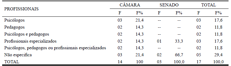 Os resultados relativos às modalidades de inserção evidenciam que as proposições postularam, prioritariamente, que a Orientação Profissional fosse ofertada de forma obrigatória pelas escolas, mas facultativa ao aluno, como atividade extracurricular e gratuita, principalmente nas redes públicas de ensino. Quanto às atividades relativas à Orientação Profissional no contexto escolar, observou-se que a aplicação de testes e a informação a respeito de cursos e profissões constituíram com 50% do total de atividades citadas nas proposições legislativas. Em geral, essas atividades apareceram quando da análise ou da justificativa da proposição, mas em 25% dos projetos analisados foram citadas apenas atividades de Orientação Vocacional ou Orientação Profissional. Novamente o PL 426/2015 se diferencia ao propor um Serviço de Orientação Profissional especializado, centrado no processo, não restrito a testes vocacionais, embora ainda voltado para o apoio à tomada de decisão sobre prosseguimento de estudos em curso técnico de nível médio e na educação superior. A última categoria analisada, como se pode observar na Tabela 5, refere-se aos profissionais encarregados pelo desenvolvimento das atividades.