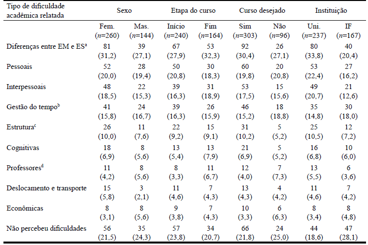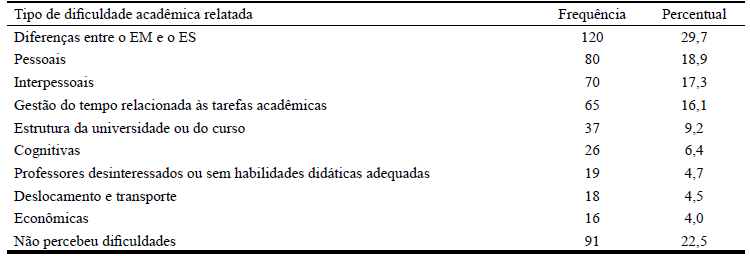 Na Tabela 1 são apresentadas as principais dificuldades acadêmicas relatadas associadas à transição para o ensino superior.