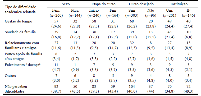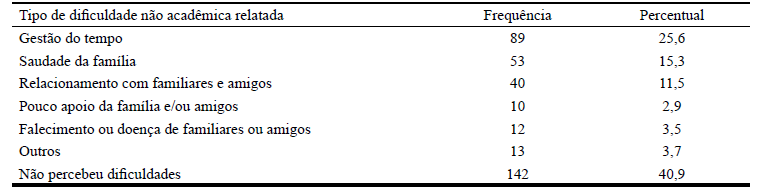 Na Tabela 3 são apresentadas as principais dificuldades (estressores) encontradas em contextos não acadêmicos (como casa, amigos etc.) durante a transição para o ES.