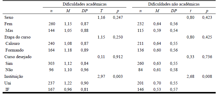 Como análise complementar, e com o intuito de possibilitar uma comparação entre os grupos em termos do número de dificuldades relatadas, foram computados os somatórios de dificuldades encontradas em contextos acadêmicos e não acadêmicos. Assim, o escore de cada participante podia se situar entre 0 e 9 (dificuldades acadêmicas) e 0 e 6 (dificuldades não acadêmicas). As médias dos grupos foram comparadas através de testes t. A Tabela 5 traz os resultados dessas comparações. Apenas na comparação entre Uni e IF foram observadas diferenças estatisticamente significativas, sendo que mais dificuldade foram percebidas na Uni. Três análises adicionais foram ainda realizadas: comparando homens e mulheres considerando o grupo de formandos e de calouros separadamente; comparando calouros e formandos considerando o grupo de homens e mulheres separadamente; e comparando estudantes em curso desejado e não desejado considerando o grupo de calouros e formandos separadamente. Em nenhuma destas comparações foi registrada diferença estatisticamente significativa.