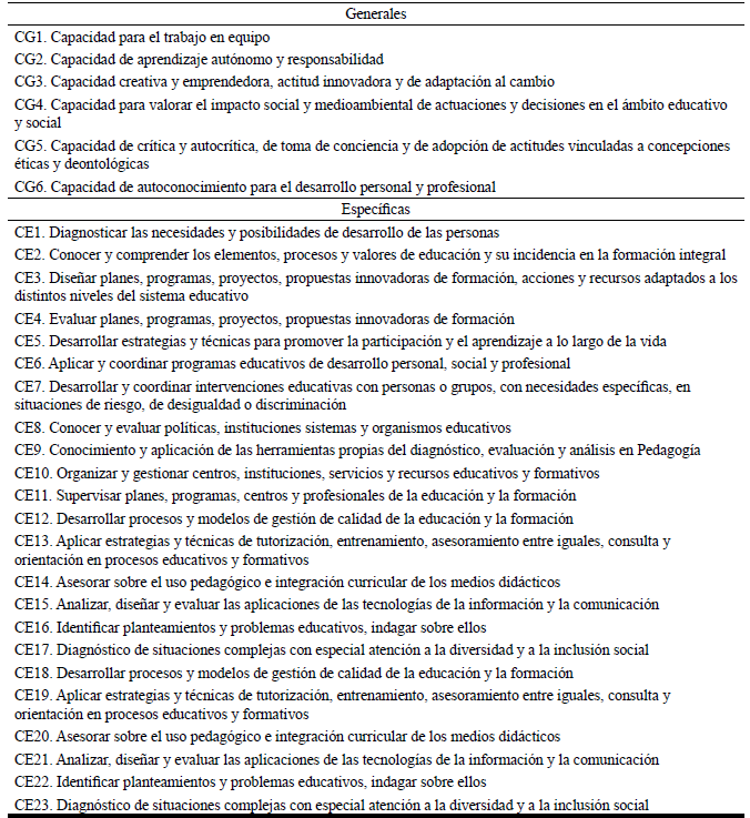 Son diversas las investigaciones cuyo objeto de estudio se centra en diferentes dimensiones del Prácticum de las titulaciones de Educación (Armengol et al.,2011; Bretones, 2013; Cabrerizo, Rubio, & Castillo, 2010; Cabrerizo, Rubio, Castillo, & Cabrerizo, 2011; Casillas, González, & Serrate, 2015; González, 2006; Latorre & Blanco, 2009; Rodicio& Iglesias, 2011; Serrate et al.,2016). En este trabajo nos centraremos en el nivel de adquisición y de desarrollo de competencias generales (CG) y específicas (CE)autopercibidas por los futuros pedagogos para el ejercicio de su profesión durante el periodo de prácticas externas.