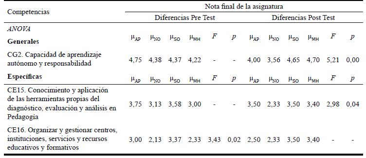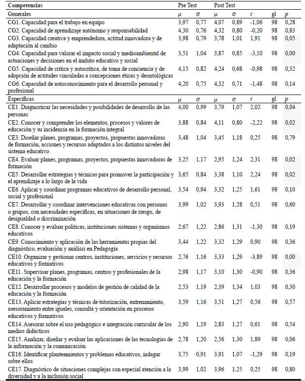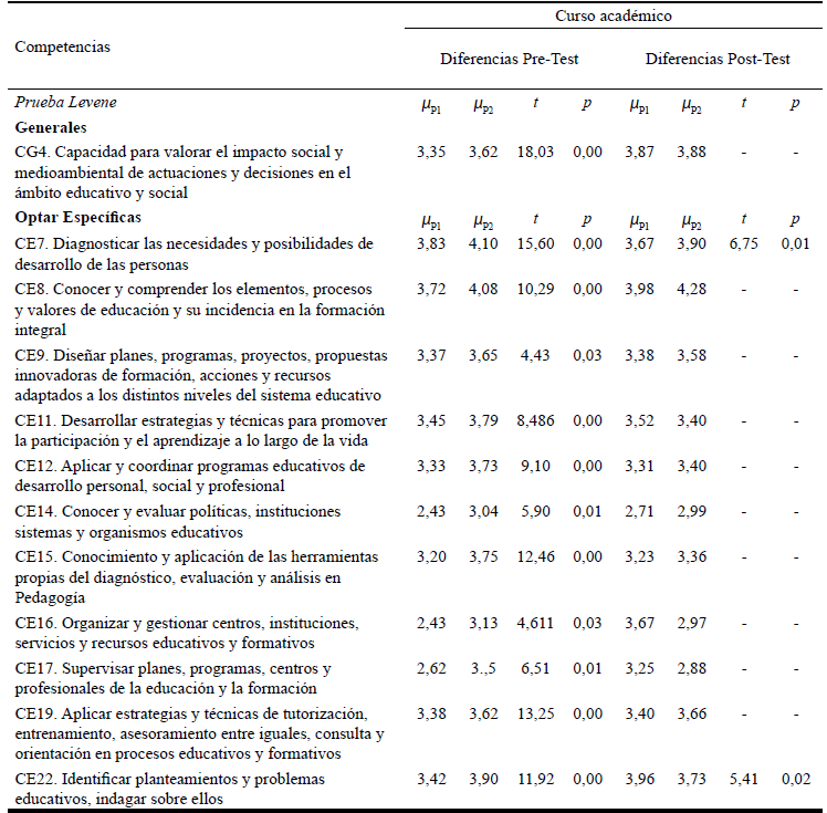 Se evidencian diferencias significativas en cuatro de las veintitrés competencias examinadas en la aplicación pre-test, vinculadas fundamentalmente a la capacidad emprendedora de los estudiantes (CG3), al diagnóstico de necesidades y posibilidades de desarrollo (CE1), a la evaluación de planes, programas y proyectos (CE4) y al desarrollo de estrategias que promuevan la participación (CE5). Respecto a la aplicación post-test, existen diferencias significativas en tres de las competencias, vinculadas a la capacidad para valorar el impacto social y medioambiental de las actuaciones como pedagogos (CG4), a la capacidad de conocer y comprender los elementos y procesos educativos (CE2) y a la organización y gestión de centros, instituciones o servicios (CE10).