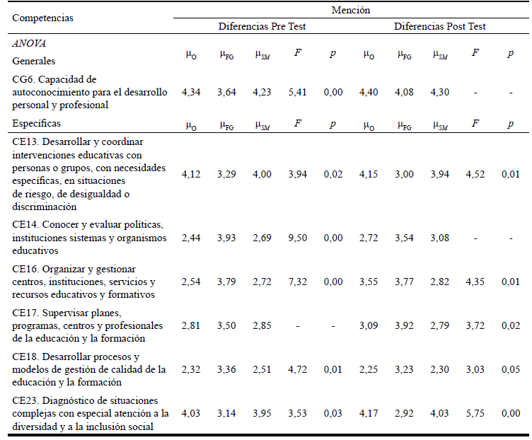 En el pos-test sin embargo, se comprobó que los estudiantes de la Mención Orientación Educativa otorgaron puntuaciones más elevadas en la adquisición de las competencias:Desarrollar y coordinar intervenciones educativas con personas o grupos, con necesidades específicas, en situaciones de riesgo, de desigualdad o discriminación (CE13) y diagnóstico de situaciones complejas con especial atención a la diversidad y a la inclusión social (CE23) en comparación con el resto de estudiantes, mientras que los estudiantes de la mención Formación y Gestión otorgan puntuaciones más elevadas, existiendo diferencias significativas respecto al resto de estudiantes, en las competencias: Organizar y gestionar centros, instituciones, servicios y recursos educativos y formativos(CE16), supervisar planes, programas, centros y profesionales de la educación y la formación (CE17) y desarrollar procesos y modelos de gestión de calidad de la educación y la formación (CE18).