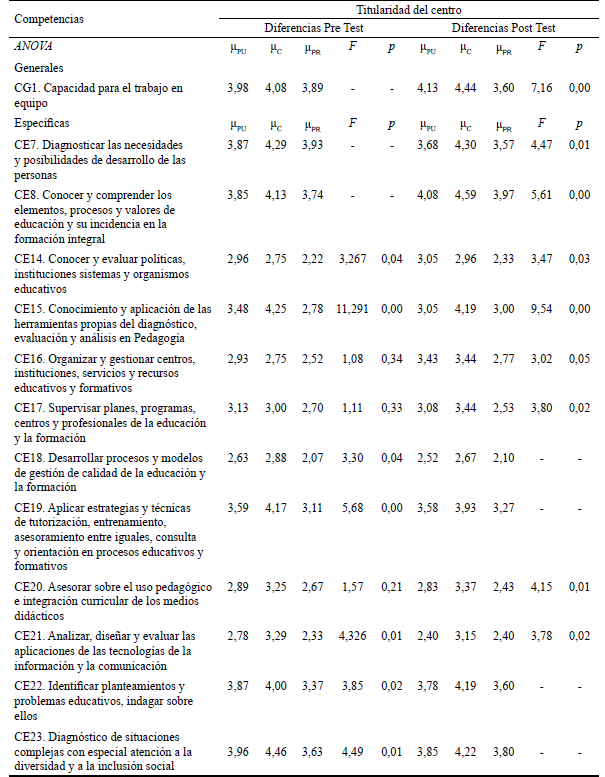 En la aplicación post-test, se verificaron dos de las diferencias observadas en la aplicación pre-test, en la adquisición de competencias, en función de los centros de titularidad pública: Conocer y evaluar políticas, instituciones sistemas y organismos educativos (CE14) y organizar y gestionar centros, instituciones, servicios y recursos educativos y formativos (CE16); y en los de titularidad concertada, en las competencias:Capacidad para el trabajo en equipo (CG1), diagnosticar las necesidades y posibilidades de desarrollo de las personas (CE7), conocer y comprender los elementos, procesos y valores de educación y su incidencia en la formación integral (CE8), conocimiento y aplicación de las herramientas propias del diagnóstico, evaluación y análisis en Pedagogía (CE15), supervisar planes, programas, centros y profesionales de la educación y la formación (CE17), asesorar sobre el uso pedagógico e integración curricular de los medios didácticos (CE20) y analizar, diseñar y evaluar las aplicaciones de las tecnologías de la información y la comunicación (CE21).