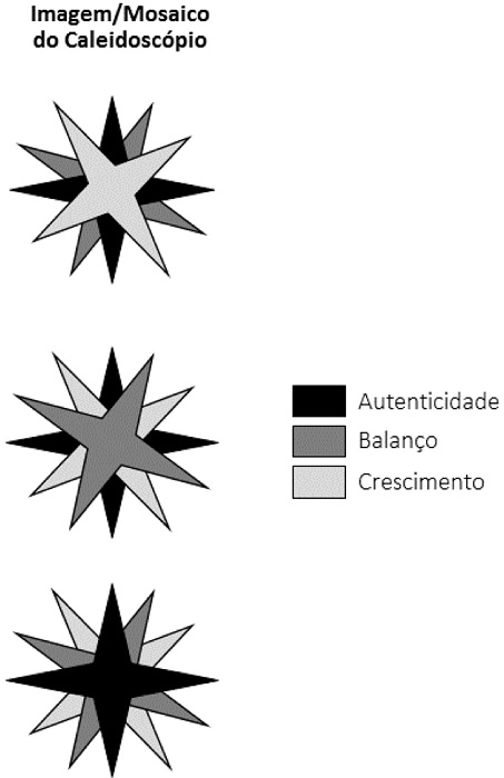 Cada mudança em relação aos parâmetros (Autenticidade, Balanço e Crescimento) corresponde à alteração no estilo de vida dos indivíduos e na forma como os diferentes aspectos compõem o seu contexto atual. Utilizando uma metáfora, pode-se pensar que as cores do caleidoscópio são refletidas nestes três parâmetros. Ao longo do ciclo de vida, as cores do caleidoscópio se alternam para adequarem-se ao contexto atual, fazendo com que uma cor (parâmetro) se torne mais proeminente e sirva de orientação para a tomada de decisões de carreira. Como consequência, as demais cores vão para o fundo do mosaico, mas continuam presentes, formando a imagem no caleidoscópio (Maniero & Sullivan, 2005). Embora os demais parâmetros tenham sua influência reduzida, assumindo um papel secundário no processo decisório, eles ainda permanecem presentes e ativos, pois são relevantes para a criação do “mosaico” de vida ou de carreira de um indivíduo (Sullivan & Baruch, 2009). Essa metáfora é demonstrada na Figura 1.