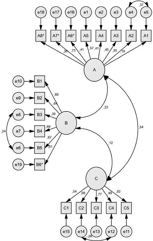 Diante do não ajuste dos modelos M1 e M2, foram testados outros dois modelos com reespecificação dos erros das medidas, um considerando o modelo original de 15 itens (M3) e outro, o modelo adaptado de 19 itens (M4). As variáveis para covariância dos erros foram selecionadas a partir dos índices de modificação oferecidos pela saída de dados do AMOS, sendo escolhidas as variáveis (e4 – e5; e8 - e6 e; e14 – e12). O modelo original reespecificado (M3) obteve os seguintes indicadores de ajuste: χ2 = 200,042, g.l. = 98 (p < 0,001), χ2 /g.l. = 2,04 CFI = 0, 889, TLI = 0,864, RMSEA (90%CI) = 0,062 (0,050 – 0,074). Por sua vez, os índices de adequação do modelo adaptado reespecificado (M4) foram: χ2 = 263,021, g.l. = 146 (p < 0,001), χ2 /gl = 1,80, CFI = 0, 898, TLI = 0,881, RMSEA (90%CI) = 0,054 (0,044 – 0,065). A Figura 2 apresenta o diagrama do modelo adaptado reespecificado (M4), considerado aquele com os melhores indicadores de ajuste.