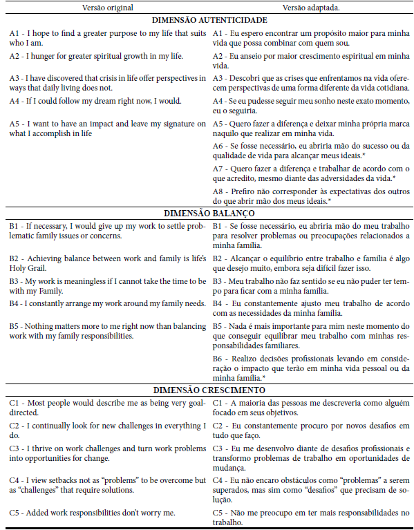 Criação de novos itens: Após o consentimento da autora da escala original, iniciou-se um estudo piloto para obter evidências de validade do instrumento. Em uma análise preliminar com 90 participantes, verificou-se que os parâmetros Autenticidade e Balanço possuíam itens de baixa qualidade em relação à análise fatorial confirmatória de três fatores. Diante deste resultado, os pesquisadores optaram pela criação de três novos itens para o parâmetro Autenticidade e de um novo item para o parâmetro Balanço para a versão brasileira da escala, com base em revisão de literatura sobre o modelo. Após, procedeu-se a uma coleta de dados com novos participantes para a investigação das evidências de validadeda versão final do instrumento, composto pelos 15 itens originais acrescidos dos 4 novos itens criados para a versão brasileira do instrumento, perfazendo uma escala de 19 itens no total.