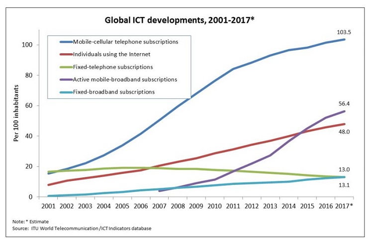 Mobile leapfrogging is a concept used in reference to economic growth theories and industrialization. Leapfrogging has more recently been used in the context of sustainable development for developing countries within the world development theories. Technological leapfrogging therefore refers to the acceleration of development through the skipping of low-grade, less efficient, and more costly technologies and industries in favour of the direct adoption of more effective and advanced technologies. As shown figure 1: Global ICT development chart from year 2001 - 2007 ITU World Telecommunication report, the Mobile cellular utilization has surpassed all traditional forms of technologies steady of the years across all geographies in the globe.