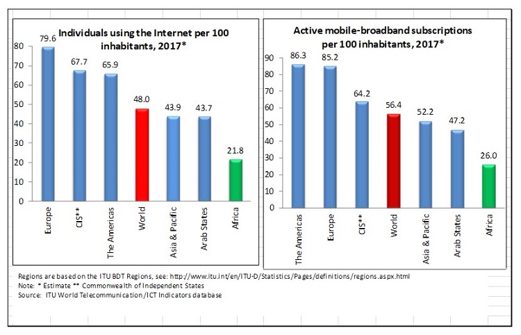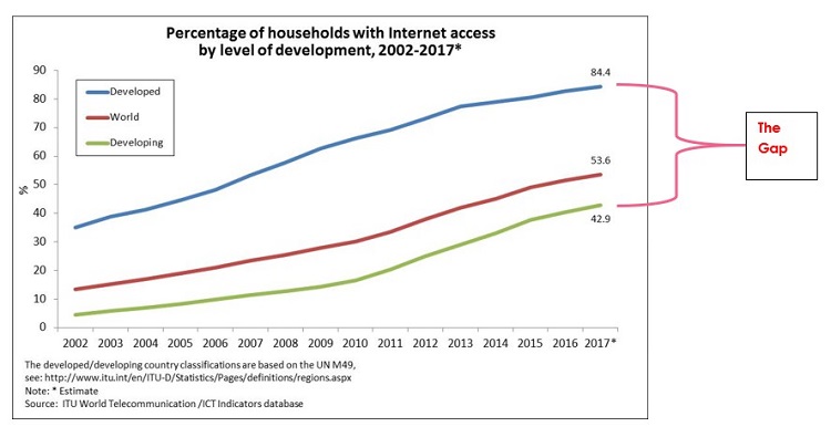A digital divide is an economic and social inequality with regard to access to, use of, or impact of information and communication technologies (ICT). The divide within countries or continents or between developed and developing world may refer to inequalities between individuals, households, businesses, or geographic areas, usually at different socioeconomic levels or other demographic categories. Fig 2 below illustrates the gapping between the developed and the developing world in terms of house hold internet access between the year 2002 and the year 2017. The divide between differing countries or regions of the world is referred to as the global digital divide, examining this technological gap between developing and developed countries on an international scale as shown in figures 2, 3 and 4 below.