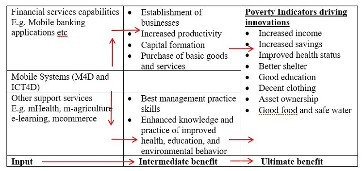 The spiral effect is that poverty indicators which have been felt for a long time in African continent, drives the populace to seek ways to create jobs directly and indirectly. Theoretically the concept of looking at ICT ecosystem explains the relationships between innovations and poverty driver’s reduction on technical, economic and social angles. The diagram in figure 5 below, illustrates the poverty indicators that act as drivers to the ICT innovations in the ecosystem.