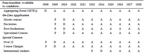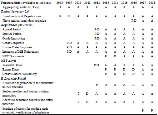 Since 2009, as previously stated, ISCSP has undergone a profound transformation in its information systems. Following the best practices of strategic planning and corporate IT architecture process (Perks & Beveridge, 2003:12-17) we reached the solution and application architecture. A platform where selected with the fundamental key services to the academia business. Following the annual business planning process, each year several new e-services (automatic functionalities) were identified for candidates, students, teachers and administrative staff. These e-services were planned (P) at the first moment, after they are designed (D) and after the implementation, they are used by the final actors (A).