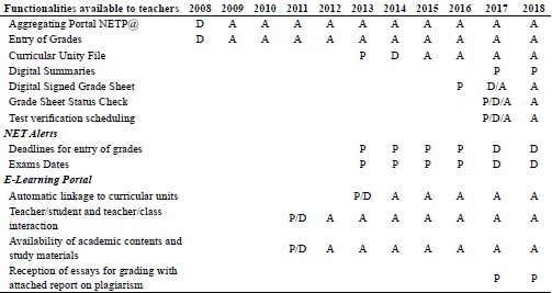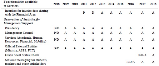 From the analysis of the tables above it is possible to see that in the beginning, efforts were clearly focused on the back-office processes and grades registry. Progressively there has been a shift towards front-offices processes, such as the interaction with candidates, teachers and students. It may be noticed that the latter functionalities were concerned with the digital interactions of ISCSP with other governmental institutions.