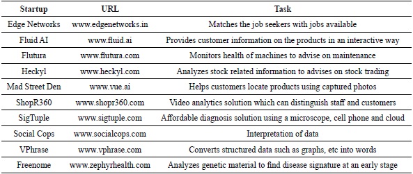 Several startup companies have emerged in India in the recent past (Jain, 2017). According to a report by Zinnov, there are around 170 AI related startups in India and these have received an investment of $36 million in total (India-based…, 2018). 64 out of these are located in Bengaluru. These are working in the domains of healthcare, e-commerce, finance, etc. Tuplejump, a startup helps the clients visualize the data while taking a decision. It has been acquired by Apple. ClearTax is developing a solution for e-filling using documents directly. AIndra is developing devices with computer vision ability for the applications like facial recognition, detection of cervical cancer, etc. A list of example startups in India is given in Table 1.
