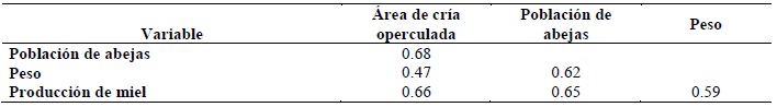 Sin considerar al tratamiento de las colonias y tomando en cuenta los valores de población de abejas, área de cría operculada, peso de las colonias a los 76 días del experimento y de la producción de miel, se observaron correlaciones positivas y significativas entre todas las variables mencionadas; los valores de correlación se presentan en el Cuadro 2.