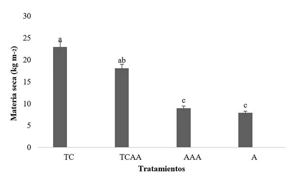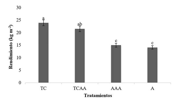 La producción de forraje en base fresca entre los tratamientos empleados fue diferente (p≤0.05). Se encontró mayor producción en los tratamientos donde se utilizó TC y TCAA, mientras que los tratamientos AAA y A tuvieron los valores más bajos (Figura 2). El incremento de la producción para el tratamiento TC fue 41 % más, comparado al control.