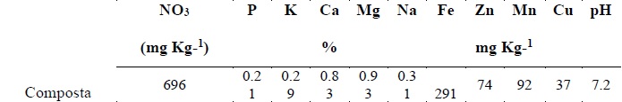 La composta utilizada (Cuadro 1) fue proporcionada por el Instituto Tecnológico de Torreón, habiendo sido sometida a compostaje por solarización. La preparación del té de composta (TC) se realizó mediante una fermentación aerobia de material vacuno compostado (100 g·L-1 de agua) de acuerdo con el método de Ingham (2005) con ligeras modificaciones. Primeramente el material fue tamizado con filtro de mallaNº 200 ASTM y pesado en una balanza granataria (Sartorius®). Posteriormente el material fue colocado en un recipiente de 60 litros de agua previamente aireada durante 2 h y se mezcló agitando constantemente. Para la aireación de la composta se colocó una bomba de oxígeno (Elite 800®) y se dejó durante 24 h. Posteriormente, la solución composta-agua fue sometida a decantación para separar el sedimento que contenía. Para disminuir la conductividad eléctrica de la solución de composta se diluyó con agua en una proporción de 0.1 L de té en 1.1 L de agua. El valor de CE inicial fue de 3.5 y la final de 1.6 dS m-1.