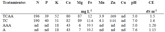 Los tratamientos TC y TCAA superaron significativamente a AAA y A debido al bajo aporte nutrimental del agua potable (Cuadro 2); ya que la producción de biomasa en FVH se favorece cuando éste se fertiliza con al menos 200 mg L-1 de N (FAO, 2001). En el presente estudio, ambos tratamientos de fertilización contenían la concentración suficiente de N para satisfacer los requerimientos del forraje. Vargas (2008, 236) indican que la fertilización es un factor que debe ser considerado para incrementar la producción de FVH, lo cual coincide con los resultados obtenidos en el presente trabajo, donde la concentración nutrimental de las soluciones nutritivas utilizadas (Cuadro 2) cubrieron los requerimientos del FVH. Preciado et al. (2014, 336) y Salas-Pérez et al. (2012, 216) señalan que los niveles de crecimiento y producción de biomasa en plantas fertilizadas con té de composta y de vermicomposta se deben principalmente a que los nutrientes contenidos en estas soluciones se encuentran en forma iónica y por lo tanto están disponibles para las plantas. Estos autores señalan que la alta disponibilidad de nutrientes en dichas soluciones orgánicas es atribuible a los procesos de fermentación aeróbica realizados por microorganismos contenidos en la materia orgánica, lo cual en combinación con la presencia de ácidos orgánicos y otras sustancias biológicamente activas, actúan como reguladores de crecimiento vegetal, e incrementan finalmente la biodisponibilidad de los nutrientes para las plantas.