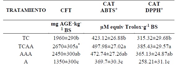 El contenido de compuestos fenólicos totales fue diferente (p≤ 0.05) entre tratamientos (Cuadro 3). Hubo un incremento del 56 % más para el tratamiento TCAA respecto al tratamiento control. TCAA fue similar al tratamiento AAA. Le siguió el tratamiento TC y el tratamiento control generó menor contenido de compuestos fenólicos totales.