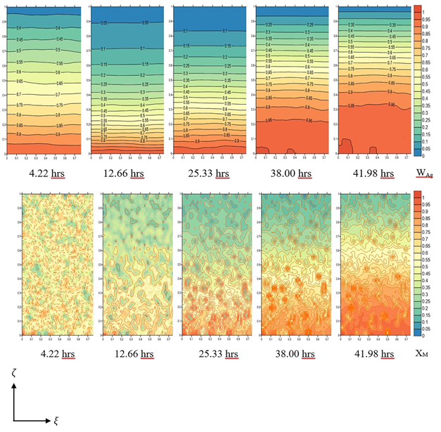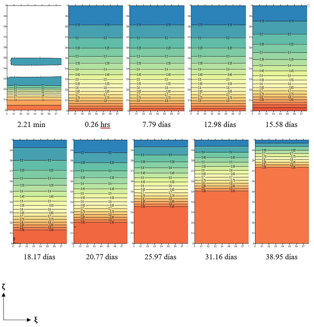 La Figura 10 muestra el análisis de las isolíneas de concentración WAg y los contornos de biomasa XM, se observa la distribución de la biomasa a lo largo del biofiltro para 41.98 hrs, resaltando a mayor acumulación de biomasa una disminución de eficiencia en el sistema. Por ejemplo, observando el panel de 38 hrs para XM donde las zonas anaranjadas representan mayor concentración de biomasa en la parte inferior del sistema y con una eficiencia de remoción hasta un 75% aproximadamente.
