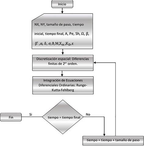 El código computacional empleado en este trabajo está basado en diferencias finitas para discretizar los operadores espaciales y el método de Runge-Kutta-Fehlberg para la integración de los operadores temporales, tal como se describe en la Figura 2. Previamente este mismo código computacional ya se había empleado para la solución del modelo propuesto por Calderón-Alvarado et al. (2016).