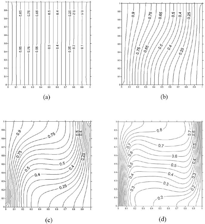 Donde b y b+1 denotan las fronteras y sus nodos adyacentes, respectivamente. La Figura 3 muestra las etapas finales (variación de las variables dependientes con respecto al tiempo menor a 1x10-6) del cálculo de BIOFILF2 para 0 ≤ Ra ≤ 1x105, las cuales son comparables con los estados estables reportados (benchmark) por De Vahl Davis (1983).