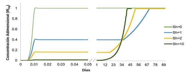 En la Figura 4, se muestra la influencia del número de Sherwood sobre la tasa máxima de remoción de contaminantes. Al incrementarse este número adimensional, la concentración adimensional promedio a la salida del biofiltro decrece. Así mismo, el punto de ruptura del sistema se desplaza (se acorta el tiempo en el que se pierde eficiencia) con el cambio del Sh. Para sistemas con Sh=0, se evoluciona rápidamente hacia el estado estable (concentración adimensional WAg = 1), con lo que el pequeño retardo de las gráficas se ve representado como una vertiginosa subida en la concentración adimensional al inicio de la simulación. Estos resultados (tasa de remoción máxima) son consistentes con los reportes de la literatura, resumidos en la Tabla 3, construida aplicando la correlación de Hartmans y Tramper (1991) para fermentación en estado sólido (Sh = 2 + 0.57Re0.5Sc0.33) sobre diversos estudios experimentales en biofiltración.