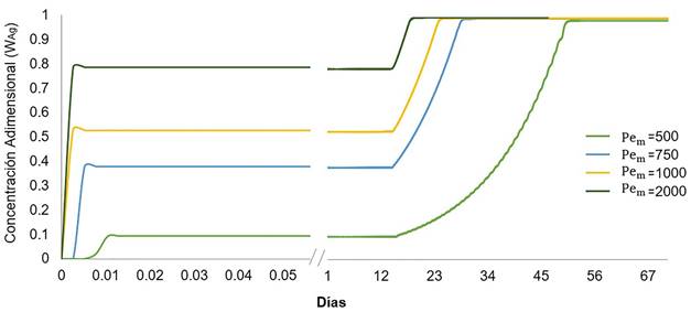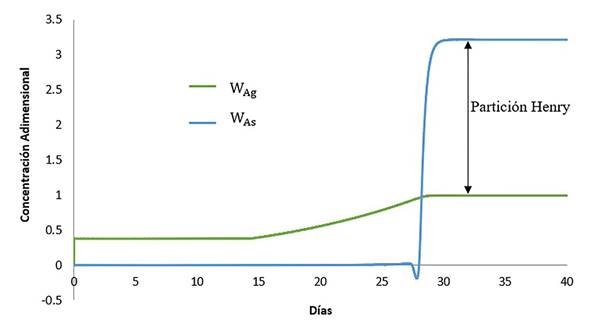 En la Figura 6 se muestran las dinámicas de concentración del contaminante A en el medio poroso, para 40 días de operación. Se observa a partir del día 15 un aumento en la concentración a la salida del sistema, inicialmente se tiene una concentración menor de 0.15 adimensional equivalente a una eficiencia mayor al 85%, posteriormente al día 20 una concentración de 0.2 adimensional y a una eficiencia del 80% y en el día 31 una concentración de 0.4 adimensional a la salida representando solo el 60% de remoción en el sistema, lo cual concuerda con la cinética WAg mostrada en la Figura 5.