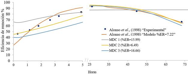 En los modelos MDC2 y MDC3 se incluyó una estrategia de pseudo-localización de la biomasa en el biofiltro, con lo que los números Pem, Sh y aspecto geométrico A (Apéndice A), se convierten en funciones del tiempo. La Figura 8 muestra las simulaciones hechas para los datos de la Tabla 1 con los tres niveles de sofisticación de MDC.