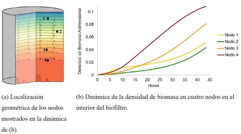 El crecimiento puede observarse en el aumento de la densidad de biomasa adimensional. En la Figura 9a se muestra un diagrama de contornos 2-D en el que las zonas oscuras (tonalidades rojas) representan saturación total del espacio vacío en el biofiltro. Los nodos (1, 2, 3 y 4) son los puntos arbitrariamente seleccionados, graficados en 9b, donde se aprecia claramente la dinámica no lineal que cambia con el avance del tiempo, por citar un ejemplo; el nodo 1, que se encuentra expuesto a menores concentraciones de sustrato (antes de las 20 horas), presenta una densidad superior al nodo 4, sin embargo, aproximadamente a las 20 horas la tendencia se invierte, ya que las zonas cercanas a la entrada han sido saturadas y el tiempo de residencia (local) de la fase fluida disminuye, con lo que el sustrato no es removido y avanza hacia zonas cercanas a la salida del biofiltro. Ozis et al. (2007) han propuesto una estrategia estadística (percolación) bastante efectiva que logra resultados similares, mapeando en 2-D algunos lechos porosos con desarrollo de biomasa; no obstante, esta estrategia requiere abundante información característica del lecho (estudios de imágenes). En este sentido, uno de los argumentos más usuales para sostener el uso de modelos estadísticos se basa en la topología tridimensional muy compleja y no reproducible de un lecho típico de fermentación en estado sólido (Hasan et al., 1998; Sahir et al., 2007; Ozis et al., 2007), por lo que, en MDC3, se incluyó la estrategia pseudo-aleatoria de distribución del inóculo empleada por Oliveros-Muñoz et al. (2017), conservando así la sencillez de los modelos tipo MDC, pero sin realizar diversas simulaciones y promediar los resultados, demostrando validez estadística sin el empleo de los enfoques de percolación.