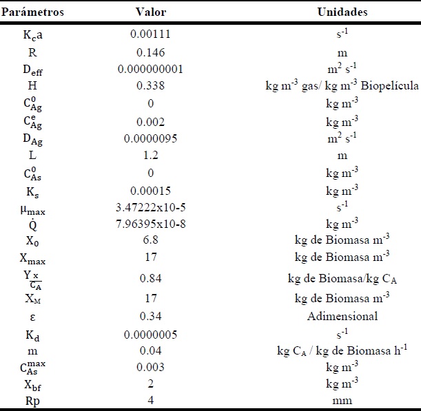 Para los tres niveles de sofisticación se emplearon valores típicos de biofiltración de COV’s. En la Tabla 1 se enlistan los parámetros usados para los tres niveles de sofisticación MDC1, MDC2 y MDC3, los grupos adimensionales que demandan los parámetros se enlistan en el Apéndice A.