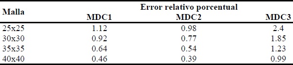 Se realizó un análisis de independencia de malla, considerando un malleo adecuado de 40 x 40 para los tres niveles de sofisticación obteniéndose un error relativo menor al 1% como se muestra en la Tabla 2. El incremento de la malla no muestra mejoras significativas por lo cual ya no se realizó el análisis para una malleo mayor al reportado.