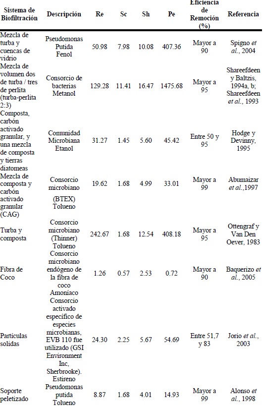 Devinny et al. (1998) desarrollan un modelo para predecir la eficiencia de remoción tomando en cuenta once compuestos orgánicos volátiles. Empleando relaciones cuantitativas estructura-actividad, concluyen que tres parámetros son importantes en la operación del sistema de biofiltración entre ellos la constante de (Henry Aizpuru et al., 2002). Sin embargo, esta clase de estudios requiere un gran número de datos experimentales y se limita a las condiciones en las que se llevó a cabo. Alonso et al. (2001) validan un modelo para el tratamiento de éter en un biofiltro percolador de lecho sintético (partículas esféricas), analizando la adición de nitrato como nutriente y un lavado periódico para eliminar el exceso de biomasa. El modelo consta de dos ecuaciones en coordenadas cilíndricas (bidimensionales); una describe la transferencia de masa en la fase gaseosa y la otra; la difusión y reacción en la biopelícula. La concentración de éter y nitrato (NO3 fuente de nitrógeno) en la biopelícula se modela mediante una cinética doble de Monod. El modelo propuesto es capaz de predecir la caída de la eficiencia debida al crecimiento microbiano.