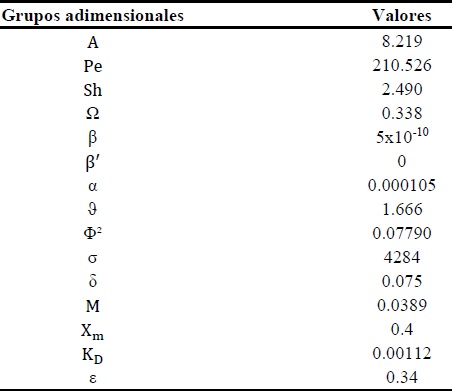 Las ecuaciones 1 a 3 fueron adimensionalizadas para obtener relaciones explícitas entre algunas dimensiones características del sistema y algunos fenómenos importantes, como el transporte interfacial y el transporte convectivo (Número de Sherwood, Sh) (Wongsuchoto et al., 2003), o las relaciones entre el transporte convectivo y el transporte difusivo de masa en el sistema (Número de Péclet, Pe). El modelo adimensional se presenta en el Apéndice A.