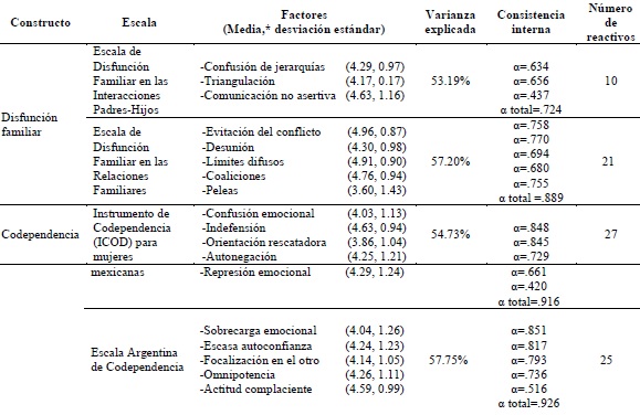 En relación con la medición de la codependencia, para la escala argentina de codependencia y para el instrumento de codependencia, se obtuvieron índices de consistencia interna y porcentajes de varianza explicada adecuadas. Los índices psicométricos más altos correspondieron a la primera, los cuales resultaron aún más altos que en la validación argentina; en el presente estudio, el análisis arrojó cinco factores, dos más (omipotencia y sobrecarga emocional) que los reportados por Biscarra et al. (2013). En el ICOD sólo los factores de orientación rescatadora y represión emocional fueron conservados en esta validación; los reactivos correspondientes al mecanismo de negación y al desarrollo incompleto de la identidad se agruparon en tres factores: autonegación, confusión emocional e indefensión. De gran interés teórico y empírico resultó la integración en dos subescalas, por análisis factorial de segundo orden, de los diez factores de las dos escalas aplicadas; éstas fueron codependencia por focalización en el otro y por autonegación, las cuales sintetizan la estructura de la codependencia en los adolescentes. Se sugieren nuevas aplicaciones de las escalas a fin de corroborar esta conformación factorial.
