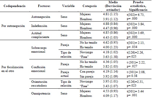 Se efectuaron análisis estadísticos de diferencias por las variables sociodemográficas registradas para los factores de codependencia. Las diferencias significativas obtenidas se muestran en la Tabla 2.