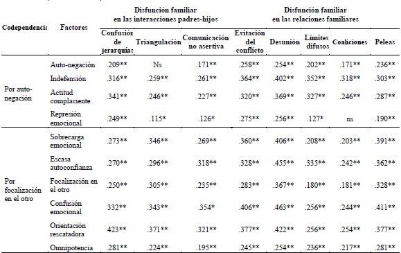 Las correlaciones más altas se observaron en el factor Desunión de disfunción familiar con Sobrecarga emocional, Escasa autoconfianza, Confusión emocional, Orientación rescatadora e Indefensión de codependencia. También Confusión emocional correlacionó significativamente (p>.001) con Evitación del conflicto, Desunión y Peleas. No estuvieron correlacionados de manera estadísticamente significativa: Autonegación con Triangulación, y Represión emocional con Coaliciones.
