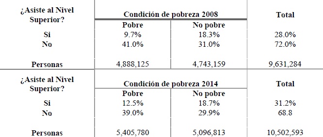 En relación con los 10.5 millones de personas que se encontraban en el rango de edad estudiado, solo el 31.2% tuvo acceso a la educación superior, 12.5% de esa población se encontraba en situación de pobreza y el 18.7% no estaban en pobreza. Por otro lado, el 68.8% de la población en edad para acceder a este nivel educativo no asistió a ninguna universidad, de estos el 38.9% se ubicó por debajo de alguna línea de pobreza y el 29.9% fueron considerados como no pobres.