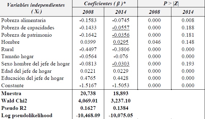 Ahora bien, los resultados del modelo Probit permitieron identificar que la probabilidad de que los jóvenes asistan a la escuela de nivel superior está condicionada de manera negativa por los tres tipos de pobreza (alimentaria, de capacidades y de patrimonio). De los tres niveles de pobreza, la alimentaria es la más persistente y la que limita en mayor medida el acceso a la educación universitaria, aunque su efecto en la probabilidad se redujo de 4.9% en 2008 a 2.4% en 2014. En este sentido, puede señalarse que la pobreza contribuye a la creación de un círculo vicioso, es decir, los hogares que están en situación de pobreza reproducen el bajo nivel educativo de sus integrantes, particularmente entre los jóvenes en el cohorte de 19 a 23 años de edad.