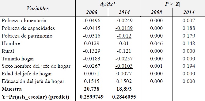 En el Cuadro 2 se presentan los coeficientes de regresión del modelo Probit para los años 2008 y 2014. Dichos coeficientes permitieron conocer de qué forma inciden los tipos de pobreza y otros factores sociodemográficos en la probabilidad de que las personas de 19 a 23 años de edad asistan a la escuela de nivel superior. Los resultados sugieren que la influencia de la pobreza alimentaria es estadísticamente significativa para los años analizados; por tanto, conforme a lo esperado (H1), este tipo de pobreza condiciona en forma negativa y de manera persistente a la asistencia escolar de nivel superior. Algo similar ocurre con los coeficientes de la pobreza de capacidades y de patrimonio al presentar signos consistentes con la hipótesis planteada (H1), lo cual indica que estos tipos de pobreza también afectan de manera adversa el acceso a la educación universitaria; sin embargo, únicamente fueron significativas para el 2008. De los tres tipos de pobreza, la alimentaria es la que condiciona en mayor magnitud la continuidad de la educación superior; dicho en otras palabras, una persona que tiene dificultades para superar la pobreza alimentaria tendrá mayor probabilidad de no asistir a la universidad.