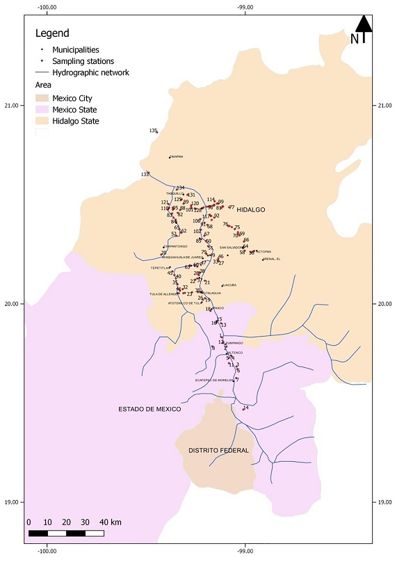 Mexico City has an estimated population of 8 985 339 inhabitants (INEGI, 2017), which makes it a challenge to satisfy the population’s growing needs regarding the allocation of drinking water, drainage and sanitation. Most rivers in Mexico City have been enclosed in pipes, and their surface waters have been classified as polluted. The rivers under these conditions are: Churubusco, de las Avenidas, de los Remedios, San Juan, de la Compañía, San Buenaventura and Tlamaco dam; therefore these rivers can be considered a part of the drainage system (Perló-Cohen & Zamora-Saenz, 2017). It is estimated that 70 % of the drinking water source in Mexico City is groundwater, and over 26 % is imported from the Lerma and Cutzamala systems; 77 % of the population consumes less than 150 L of water per day, and 96 % of the population has drainage coverage (Guerrero et al., 2009; Ortega-Font, 2011). Considering these reports, it is estimated that population in Mexico City generates an approximate volume of wastewater of 57 m3 s-1, (CONAGUA, 2012); this wastewater goes through the drainage network: grand channel-west interceptor- central emitter (Aguilar-Garduño et al., 2007), and conducted to Hidalgo state. During its course, an important volume is poured into irrigation channels and is used for crop irrigation in the Mezquital Valley (CONAGUA, 2012). In Hidalgo State an agricultural area of approximately 456 855.69 hectares is sown, 80 % of which is rainfed and 20 % undergoes irrigation systems; the greatest surface is used for maize, bean, and oats forage crops (SIAP, 2017).