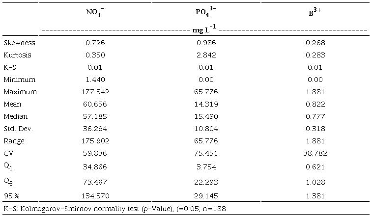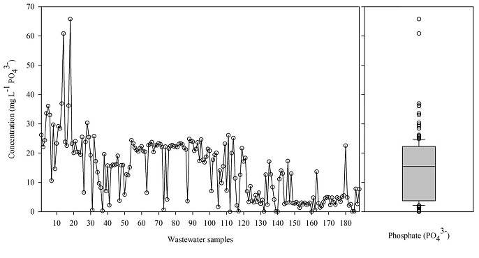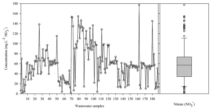 The data are asymmetrical (p-value < (); the third quartile (Q3) had a value of 73.467 mg L-1 of NO3-, and the median was of 57.185 mg L-1 of NO3-. These data indicated that wastewater contain excess of nitrate (> 30 mg L-1), 19 % of the water samples had between 5 mg L-1 and 30 mg L-1 of NO3-, and only six water samples contained lees than 5 mg L-1 of NO3-.