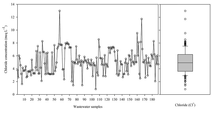 The extreme values for the concentration of Cl-, higher than the upper limit, were found in drainage water: 12.98 meq L-1 (4-Nextlalpan), 11.72 meq L-1 (113-Nith-Debodhé road), 9.52 meq L-1 (97-Bangandhó), 8.54 meq L-1 (56-Actopan) and 8.27 meq L-1 in the 129-Mercado-Ixmiquilpan sampling station.