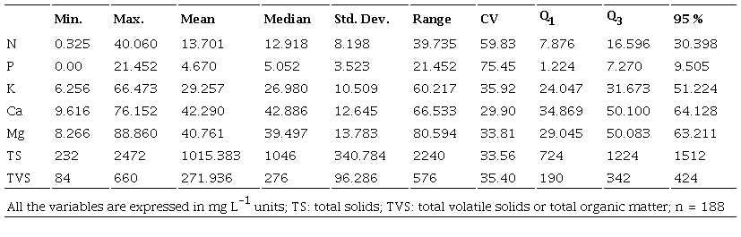 Regarding the content of nutrients, the following sequence was found, from higher to lower concentration: Ca > Mg > K > N >P. The value of the median, regarding the organic matter content, was 276 mg L-1, and the median for total solids was 1 046 mg L-1, therefore the total salt concentration was 770 mg L-1.