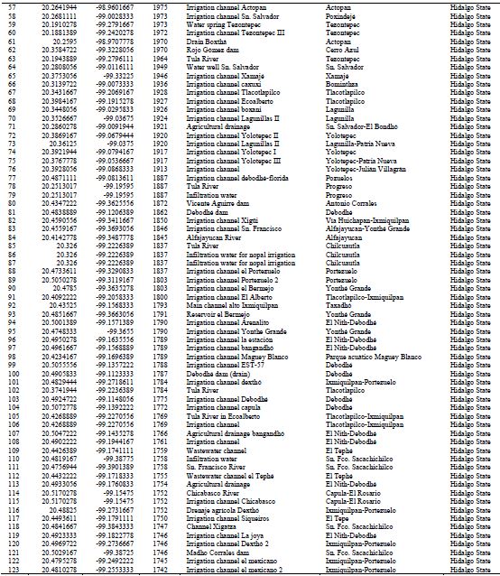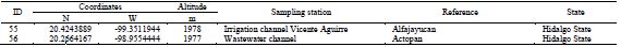 Introduction: Mexico City generates an approximate volume of wastewater of 57 m3 s-1, the wastewater is conduct by the drainage network: main channel-west interceptor-central emitter, and conducted to Hidalgo State, during it course, an important volume is poured into irrigation channels and is used for crop irrigation in the Mezquital Valley.