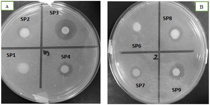 Para esta metodología solo se analizaron las cepas que presentaron mayor IS en medio sólido PVK, la cuales fueron la SP3 (2.31 y 2.59), SP4 (1.75 y 2.13), SP8 (1.7 y 2.13) y SP9 (1.83 y 1.79) en medios de crecimiento urea-glucosa-fosfato de calcio y nitrato de amonio-glucosa-fosfato de calcio, respectivamente.