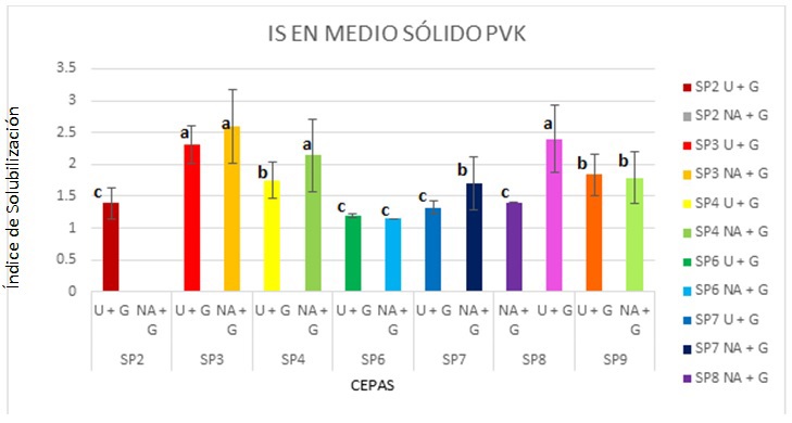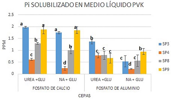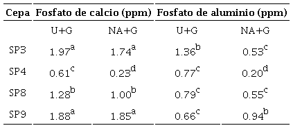 Comparando los valores de solubilización arrojados en ambos tipos de fosfato, la cepa SP3 fue la que presentó hasta 1.97 ppm, siendo la mayor cantidad de fosfato de calcio solubilizada en el medio U+G, seguida de la SP9 con un valor de 1.88 ppm en dicho medio. En el caso del medio NA+G, la máxima solubilización de P se obtuvo con la cepa SP9, alcanzando un valor de 1.85 ppm, seguida de la cepa SP3 con un valor de 1.74 ppm. Para el FA nuevamente la cepa SP3 alcanzó el valor más alto con 1.36 ppm, seguida de la SP8 con 0.79 ppm en el medio U+G. Para el medio NA+G SP9 y SP8 obtuvieron valores de 0.94 ppm y 0.55 ppm respectivamente, siendo los valores más altos (Tabla 3).