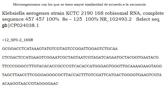 Debido a sus altos valores de solubilización, la cepa SP3 fue seleccionada para su identificación molecular y posteriores estudios de proteómica. La comparación del fragmento de ADN, obtenido por PCR y secuenciado, con la base de datos del NCBI arrojo un valor positivo para la bacteria Klebsiella aerogenes (Figura 4)