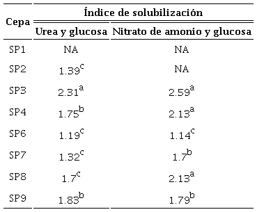 Se trabajó con las cepas SP1, SP2, SP3, SP4, SP6, SP7, SP8 y SP9, aisladas previamente de cultivos forrajeros de La Comarca Lagunera (datos no publicados) y conservadas a -20 °C en glicerol al 25 %. Se preparó un inóculo con las cepas en caldo nutritivo a 30 °C, 150 rpm por 24 horas. Se usó el medio sólido Pikovskaya (PVK) con la siguiente composición en gramos por litro: glucosa, 10; Ca3(PO4)2, 5; (NH4)2SO4, 0.5; NaCl, 0.2; MgSO4·7H2O, 0.1; KCl, 0.2; extracto de levadura, 0.5; MnSO4·H2O, 0.002; FeSO4·7H2O, 0.002, agar bacteriológico, 15. Se utilizaron diferentes fuentes de C, N y Pi en este medio y se realizó un cálculo para tener la misma cantidad de estos elementos en los medios de cultivo, independientemente de su fuente (Tabla 1). El inóculo se ajustó a una densidad óptica de 0.5 a 600 nm y se inocularon 5 μL de éste en las cajas conteniendo el medio sólido PVK. Las cajas se incubaron a 30 °C por 72 horas, los ensayos se realizaron por triplicado. A los tres días se determinó el Indicé de Solubilización (IS) relacionando el diámetro total (colonia + el halo)/el diámetro de la colonia.