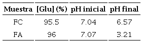 Se monitoreó el pH al principio y al final de los cultivos bacterianos (Tabla 4), se observa en ésta que en los medios que contenían FC no hubo un decremento significativo en el pH, caso contrario al medio que contenía FA como fuente de P, lo anterior se puede atribuir a una mayor presencia de ácidos orgánicos en el medio. Además se midieron azúcares reductores, se alcanzaron valores de hasta 96 y 95.5 % de consumo de glucosa para los cultivos en FA y FC respectivamente.